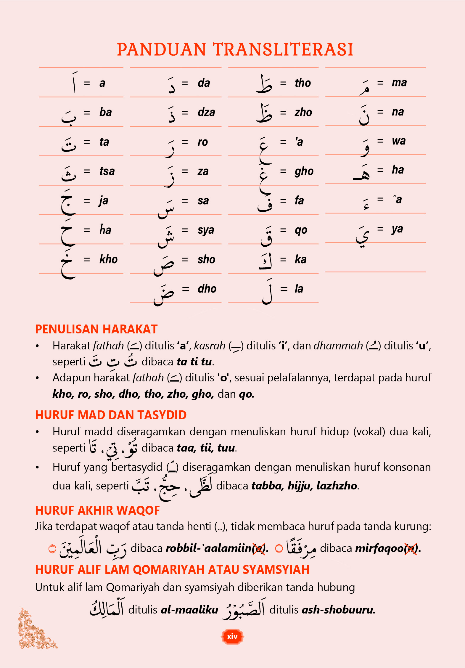- Pelafalan transliterasi yang memudahkan, disesuaikan dengan bunyi bacaanยญnya, khusus pada huruf hijaiyah, kho, ro, sho, dho, tho, zho, gho, dan qo.