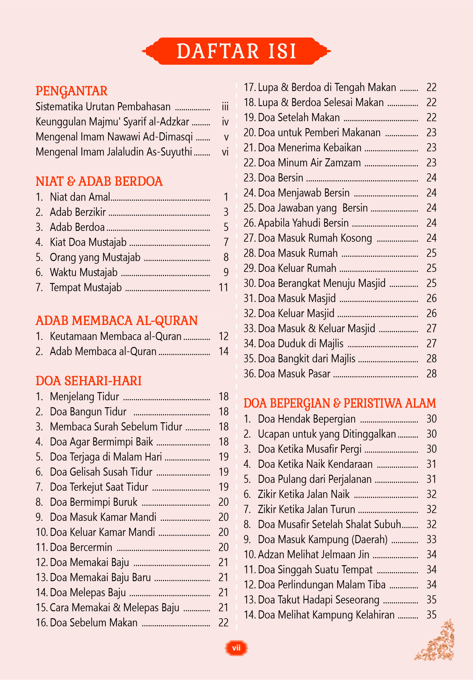 Kedua, Himpunan Doa Sehari-hari berkaitan kegiatan harian, bepergian, peristiwa alam, pernikahan, sakit, kematian, perbaikan diri, munajat, wudhu, shalat, puasa, zakat, serta perjalanan haji dan umroh, kami merujuk pada kitab al-Adzkar Imam Nawawi.